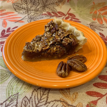 Real maple syrup lends dark color and deep flavor to traditional apple pie. The top crust is studded with toasted pecan pieces.